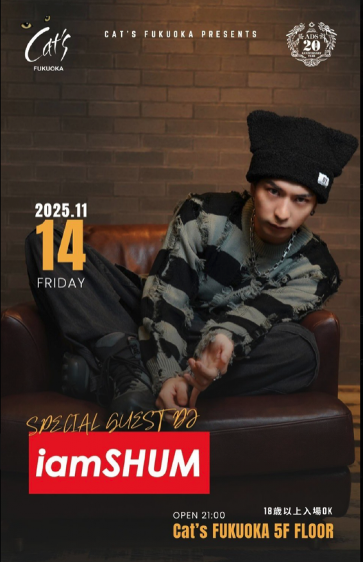 DJ Cat’s FUKUOKA 2025.11.14 - 22:00 終了しました 日時 2025年11月14日(金) 開場 22:00 / 開演 22:00 場所 Cat's FUKUOKA 出演者 iamSHUM and more Event Site - https://www.instagram.com/cats_fukuoka/