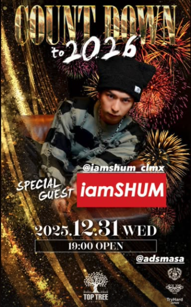 カウントダウン DJ TOP TREE “Count Down to 2026” 2025.12.31 - 19:00 終了しました 日時 2025年12月31日(水) 開場 19:00 / 開演 19:00 場所 TOP TREE okinawa 出演者 iamSHUM and more Event Site - https://www.google.com/search?client=safari&rls=en&q=TOP+TREE+okinawa&ie=UTF-8&oe=UTF-8